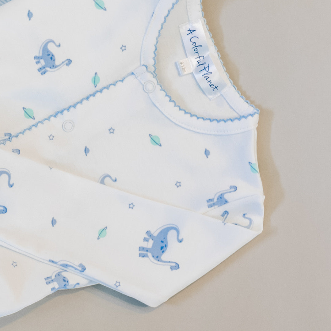 - Allover blue dinos, planets and stars print designed exclusively for A Colorful Planet.