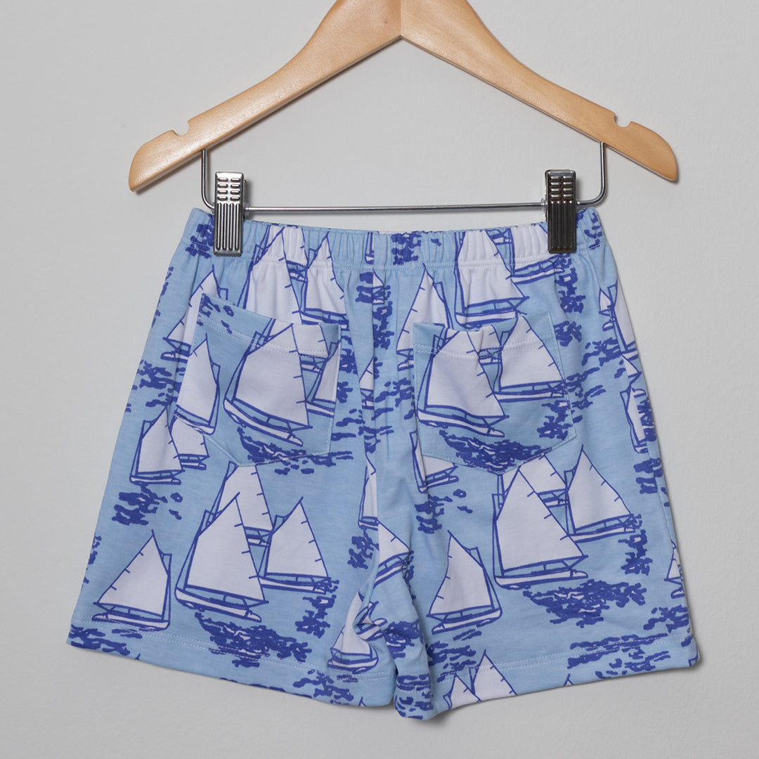 - Blue shorts with allover sail boats print.